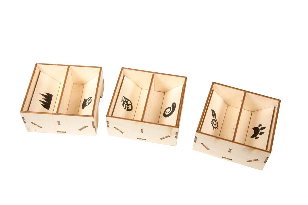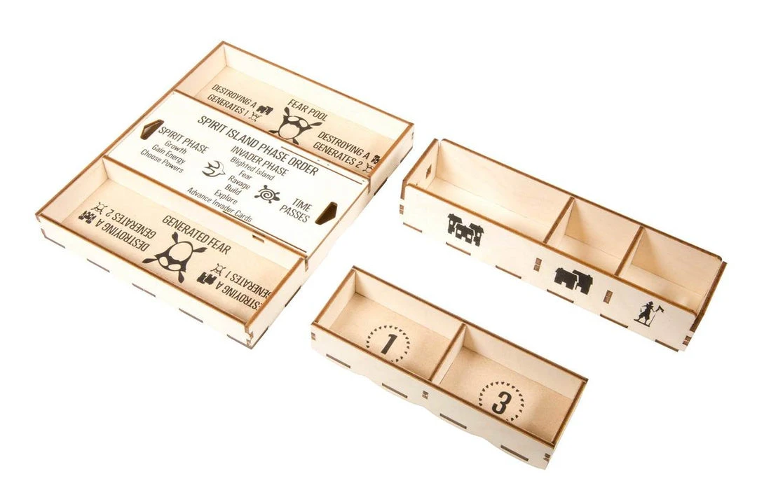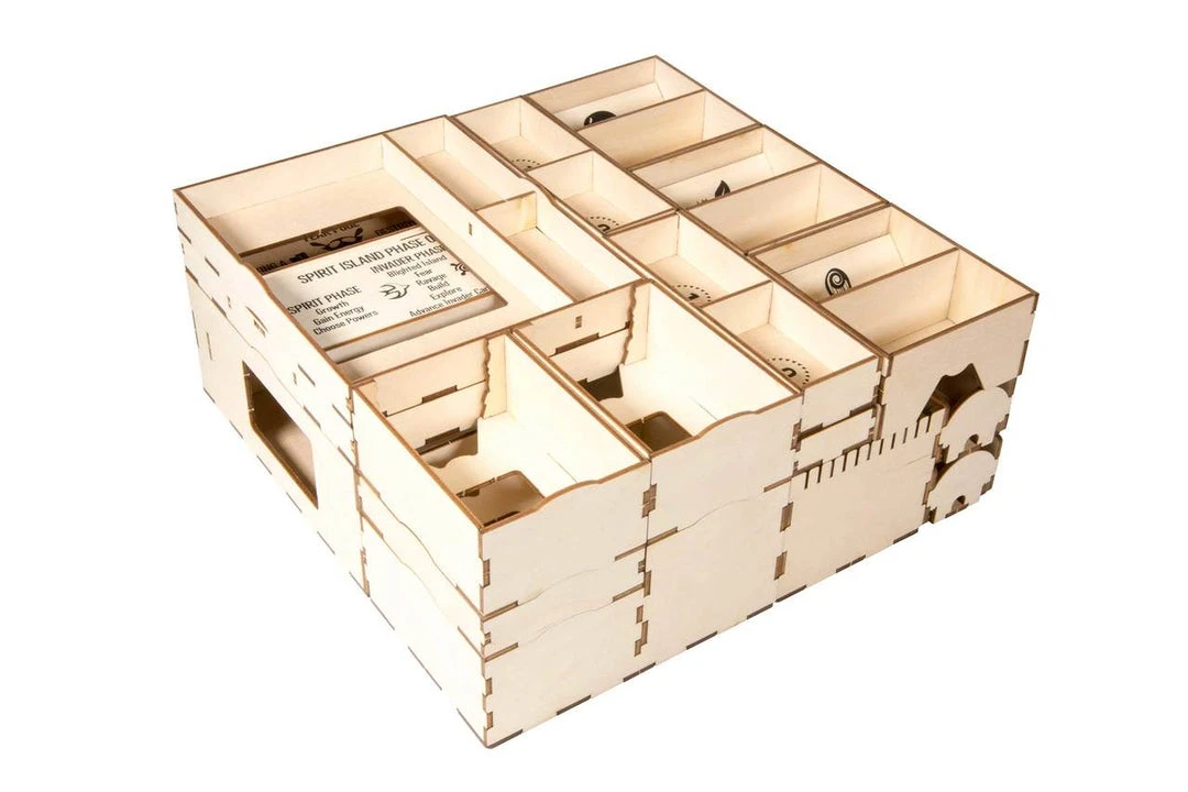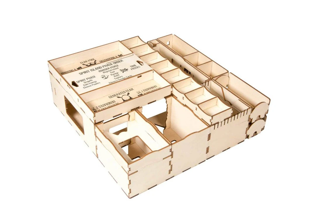 This organizer can be configured in a single box with significant lid lift, or can be split between the original Spirit Island box and the Jagged Earth expansion box, with no lift on either. Or you can upgrade your game further with the Spirit Island crate upgrade.