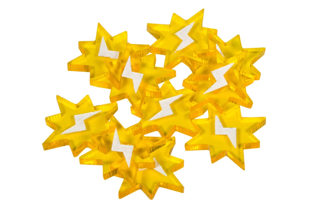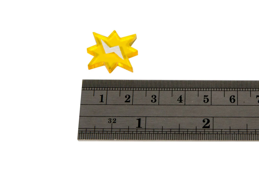 They are cut from high quality 1/8″ yellow transparent cast acrylic and engraved with a thematic symbol.