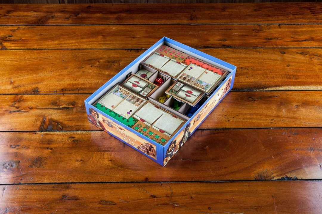 • 1x resource and coin holder, with 9 slots to keep each resource and 1x and 3x meeples separate, shutter opening for easy access to the pieces.