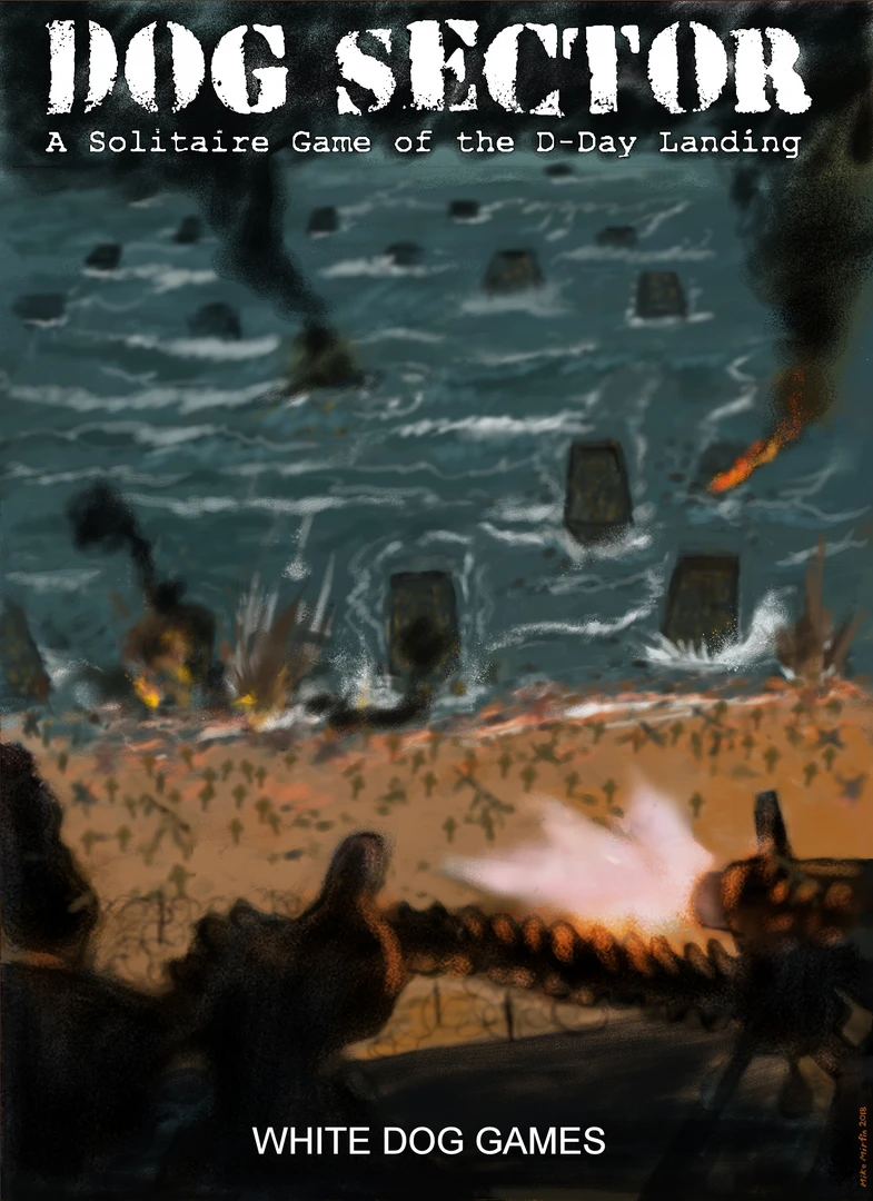Dog Sector is a beer-and-pretzels level, solitaire war game that simulates the famous WW II Normandy amphibious landing in 1944. American forces from off-map transports assault the beach. Those units not swamped during the approach attempt to move up the beach toward the German-occupied bluffs, clearing obstacles as they advance. Some units (tanks, sharpshooters, bazookas) execute ranged fire at fortified German units. Naval Forward Observers guide ship-to-shore fire support. The Player’s assault force faces German defensive fire (solitaire, system-controlled) from machine guns and anti-tank emplacements, panzerfaust and rifle fire, as well as off-map German artillery. When the bluffs are reached, American units must clear the trenches by assault. The game tension is visceral as your brave Joes are pinned down or hit by the intense German fire. You’ll grit your teeth as a Combat Engineer team deploys Bangalore torpedoes to clear obstacles while under fire, and cheer when a German unit is taken out by a tank or by a ship’s guns directed by one of your forward observers. How many sections of German trench will your men be able to clear in the twelve, heart-pounding game turns? Will you be a private or a colonel at the end of the game? Good luck, soldier!