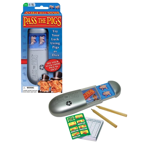 This very portable beer & pretzels game comes as a pocket travel case containing 2 pig dice, two pencils and a scoring booklet that also includes the scoring table. The pigs are actual pig miniatures, with a dot on their right flanks.