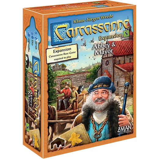 The fifth major expansion to Carcassonne, Abbey & Mayor adds 3 new wooden piece types, 6 abbey tiles, and 12 landscape tiles. The Abbey tiles act as Cloisters but do not have to match adjacent tiles and they complete adjacent features when placed. Mayors can be placed only in cities, with their strength determined by the number of pennants in the city. Barns allow players to score fields during the game rather than just at the end. Wagons are placed on roads, cities, or cloisters, and can move to an adjacent open feature when their current feature is completed.
